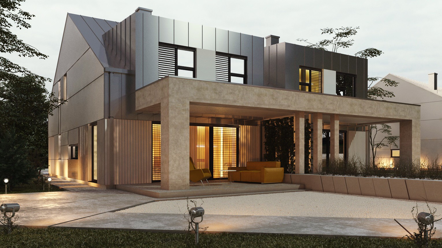 Inwestycja wyróżnia się nowoczesną bryłą, ciekawym zastosowaniem okładzin elewacyjnych i dużymi przeszkleniami zapewniającymi stały dostęp światła. Dach dwuspadowy o kącie nachylenia 30°, wymiary budynku 14 × 20 m.